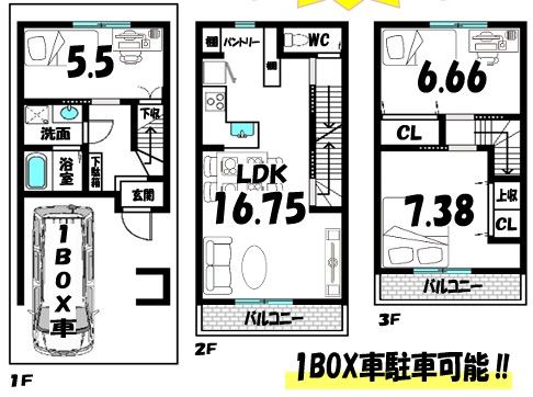 洋5.62畳(1F)、LDK16.75畳(2F)、洋6.75畳(3F)、洋7.5畳(3F) |